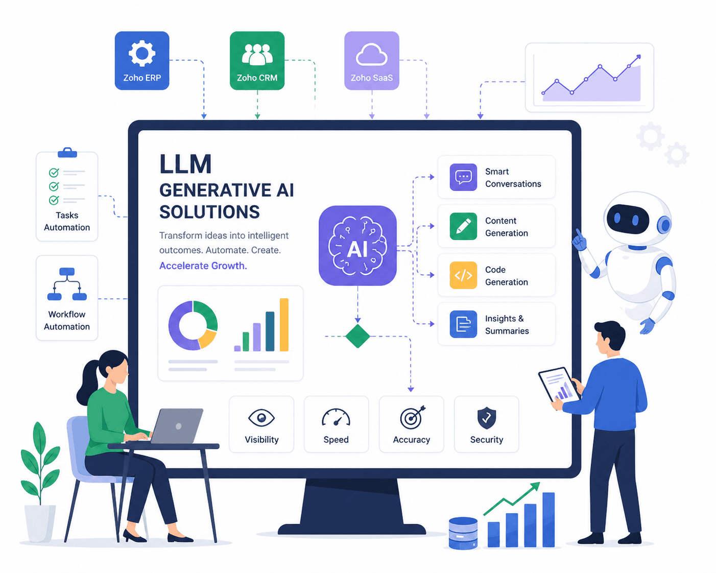 LLM Generative AI enhances Zoho platforms by automating analysis, simplifying data interpretation, and delivering actionable insights in real time.